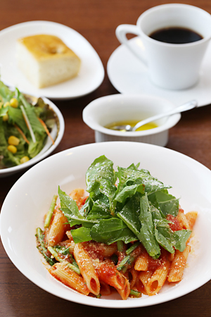 ¥1050(改訂しました) サラダ フォカッチャ パスタ(大盛り+¥250) パスタは3種類の中からお好きなパスタをお選びいただけます